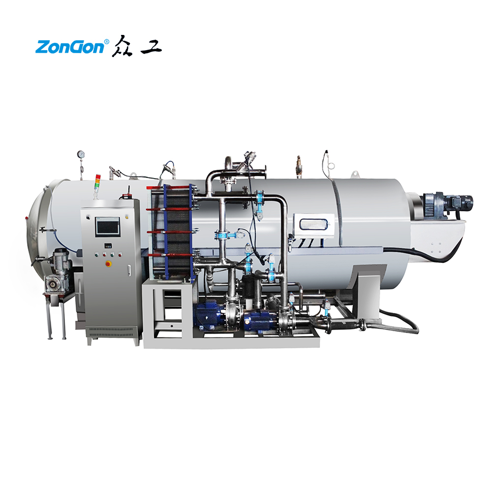 一般罐頭食品廠對(duì)罐頭作常壓水煮加熱殺菌處理時(shí)都采用本形式的臥式殺菌鍋,本設(shè)備通過引入壓縮空氣可實(shí)現(xiàn)反壓殺菌。如冷卻需在鍋內(nèi)進(jìn)行,須用水泵打入鍋頂部的噴水管(或采用水循環(huán)系統(tǒng))。在殺菌時(shí),由于加熱使罐頭溫度升高,罐頭內(nèi)壓力會(huì)超過罐外(在鍋內(nèi))的壓力。因此,為了避免殺菌時(shí)玻璃瓶罐內(nèi)增壓而跳蓋,對(duì)馬口鐵罐兩端面凸出,必須施加反壓力,特別是對(duì)需要較高殺菌溫度的肉類罐頭更就如此。使用反壓力殺菌,即是用壓縮空氣通入鍋內(nèi)增加壓力,防止罐頭凸罐和跳蓋,其操作情況分述如下: